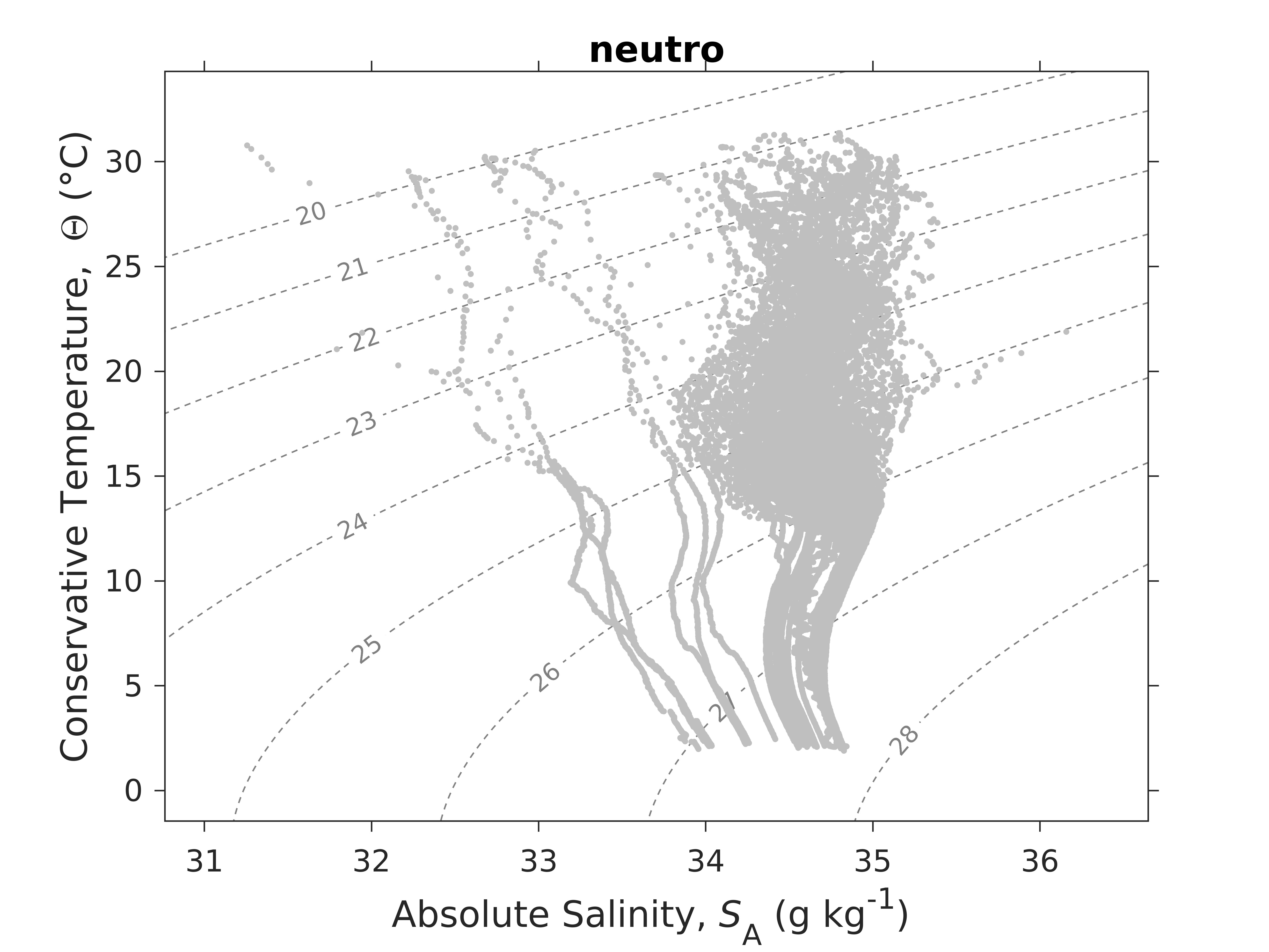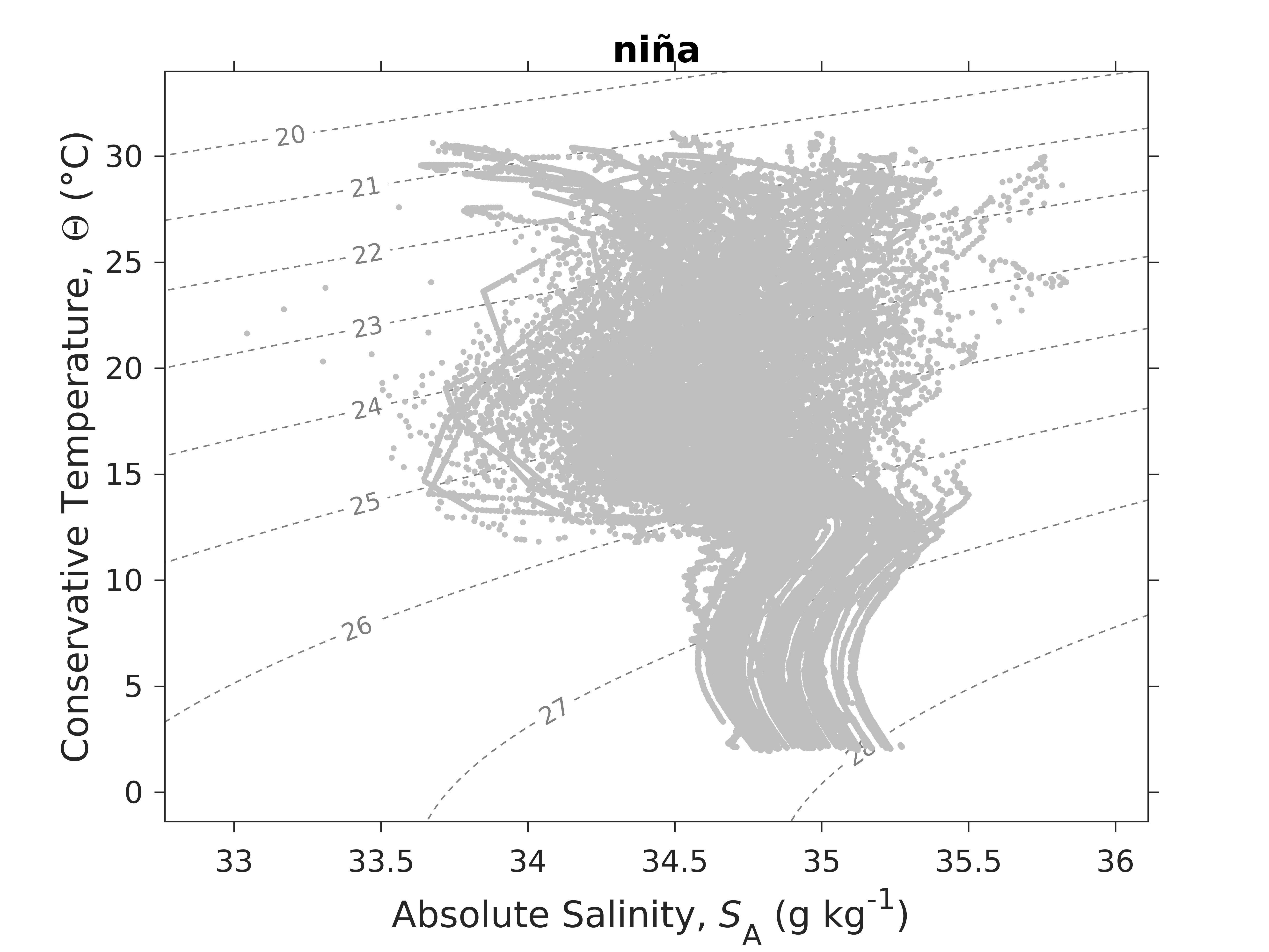 When I plot them in a T-S diagram (selected them by interanual conditions: Neutral, La Niña and El Niño) I found data in some profiles are not good or at least correct, mainly the salinity values (images attached).