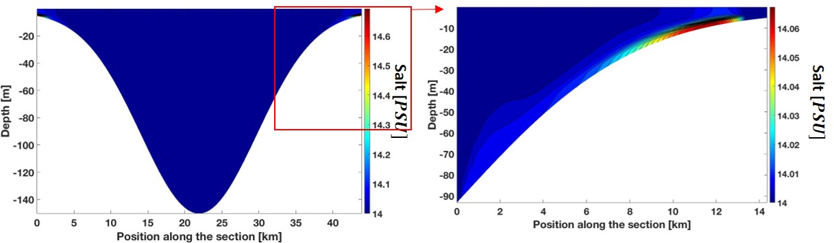 I am working with an axisymmetric idealized lake. I added two freshwater river inflows with a constant temperature of 4 degrees centigrade (I activated LUVSrc and temperature and salinity tracers). The lake surface temperature is set to freezing point temperature, and the lake's salinity is set homogeneously at 14 PSU.