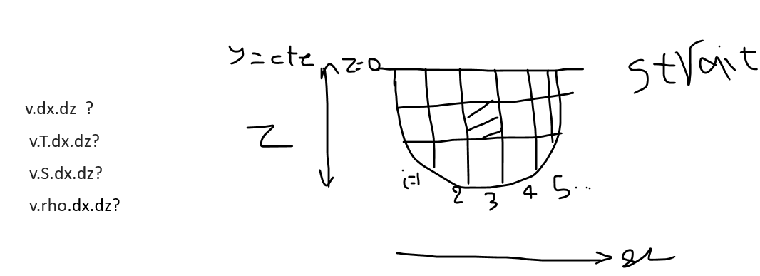 so you should sum over layers to get a vertical integral. Likewise Hvom has a "over m" meaning "times dx" so an integral in the "x" , actually i, direction is again simply a summation.Since the dz is already in there, the vertical integral of the tracer flux, weighted by cell width, is simply the summation from k=1,N. To also integrate over "x", just take the sum over "i" because the dx is already in there.
