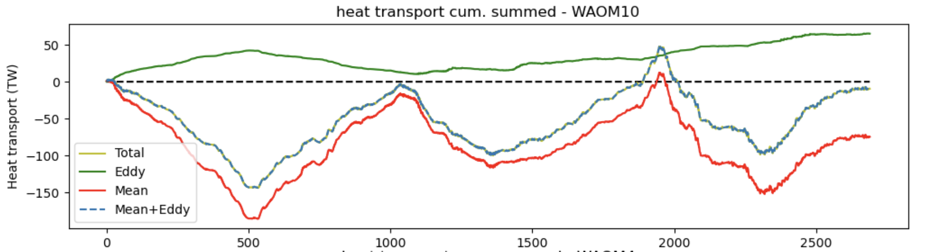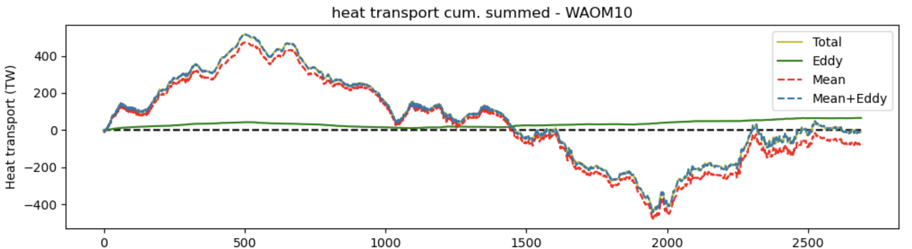 Thanks for your response. Yes, that's true! I have done exactly that, but I wanted to look at the mean and eddy components (defined as below), and the T_ref*Huon seems to be so dominant that the eddy term become nearly insignificant (i.e. the total heat transport across my 1500m isobath is nearly all due to the mean heat transport).
