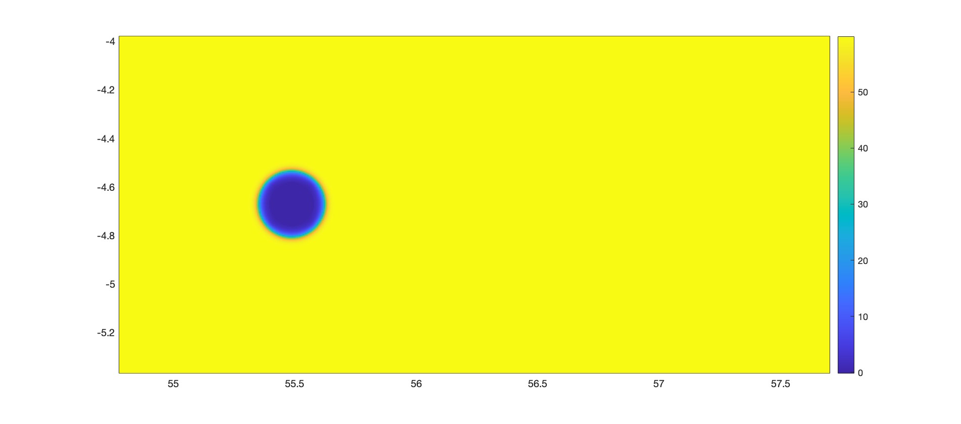 My model domain is for a circle island in shallow ocean, the bathymetry of the domain look like this: (x and y axis are longitude and latitude) Below are the relevant settings from my .h and .in files: