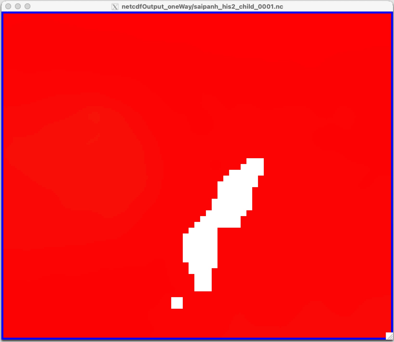 The problem shows up when I define the ONE_WAY flag on compile, which is the only thing that is changed. The zeta numbers in the interior of the child grid march off into the dingweeds but if you look at zeta late in the experiment you see that the very edge of the child grid sits exactly where it's supposed to sit. The enclosed graphic shows zeta on the child grid at the end of the experiment. The edges are all close to 1m, which matches the parent grid, but the interior has climbed up to around 4m everywhere after 5 model days which is completely unrealistic.