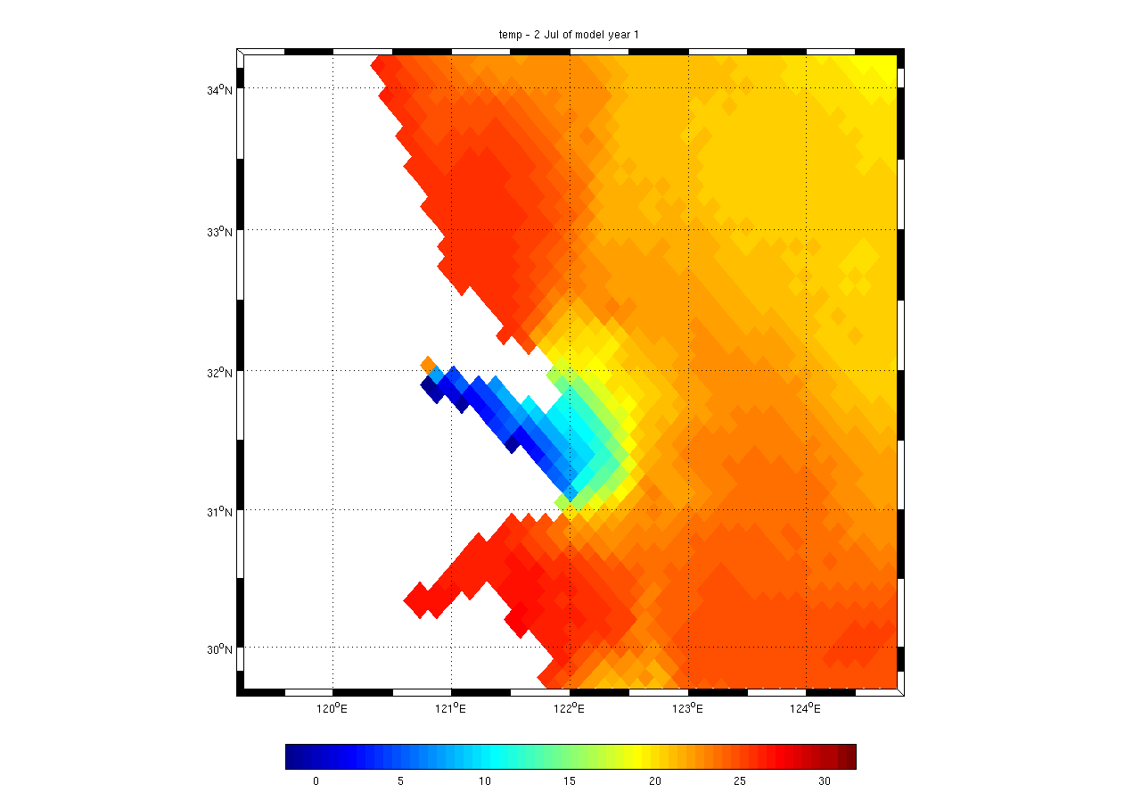 However, as pointed out by Warner,when I gave the temperature in my river forcing file together with salinity, there was no more high/low temperature in my result! I tested with higher resolution with same domain and it worked without any problem. I also tested it with tide, without tide and tide only cases, and it worked well with all the cases.