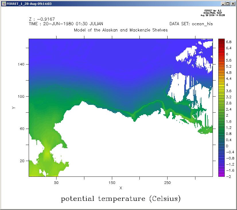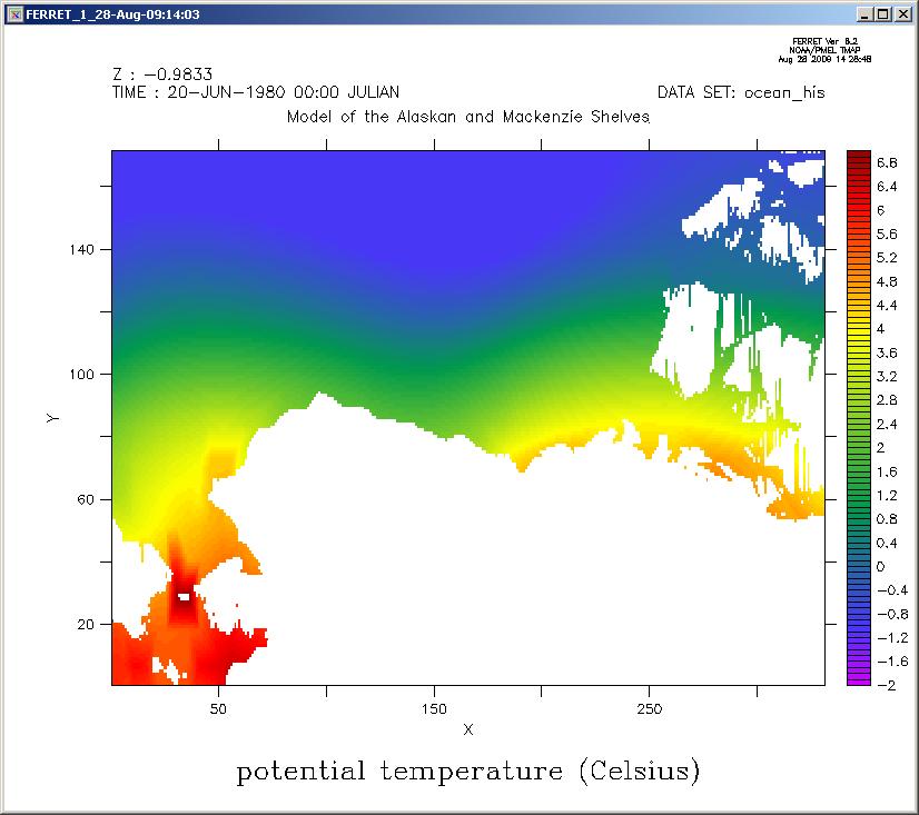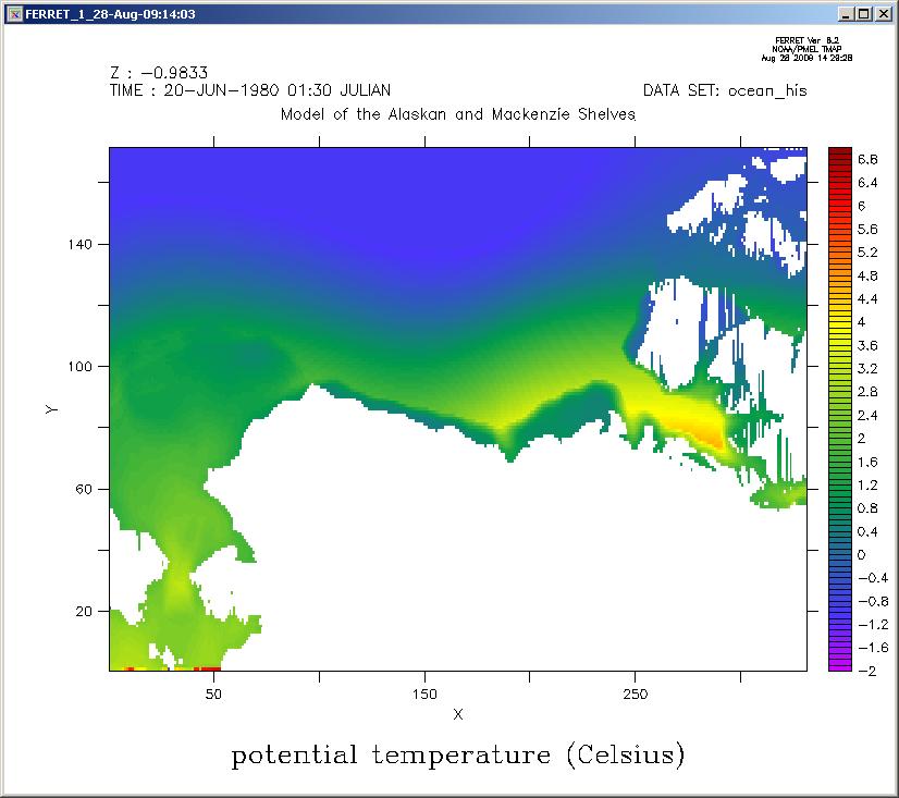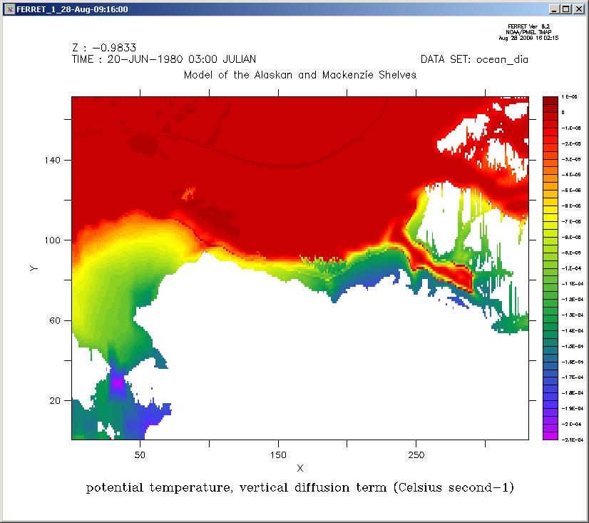 I am just getting started with ROMS, setting up an application in the Arctic for the Alaskan and Mackenzie Shelf region. I did a quick and dirty setup, just to see if I could get up and running. I have created the model grid and am able to run the model with some simple initialization and forcing, but I find that the ocean temperatures are behaving strangely. I set initial temperature conditions from Levitus values. Near the Bering Strait, the temperatures are around 6deg initially. After running the model for only an hour and a half, the temperatures drops to around 2 degrees for this area which is quite large. Where could all this heat be going and so quickly? (This run was done without sea ice.) Any thoughts are much appreciated. Thanks!