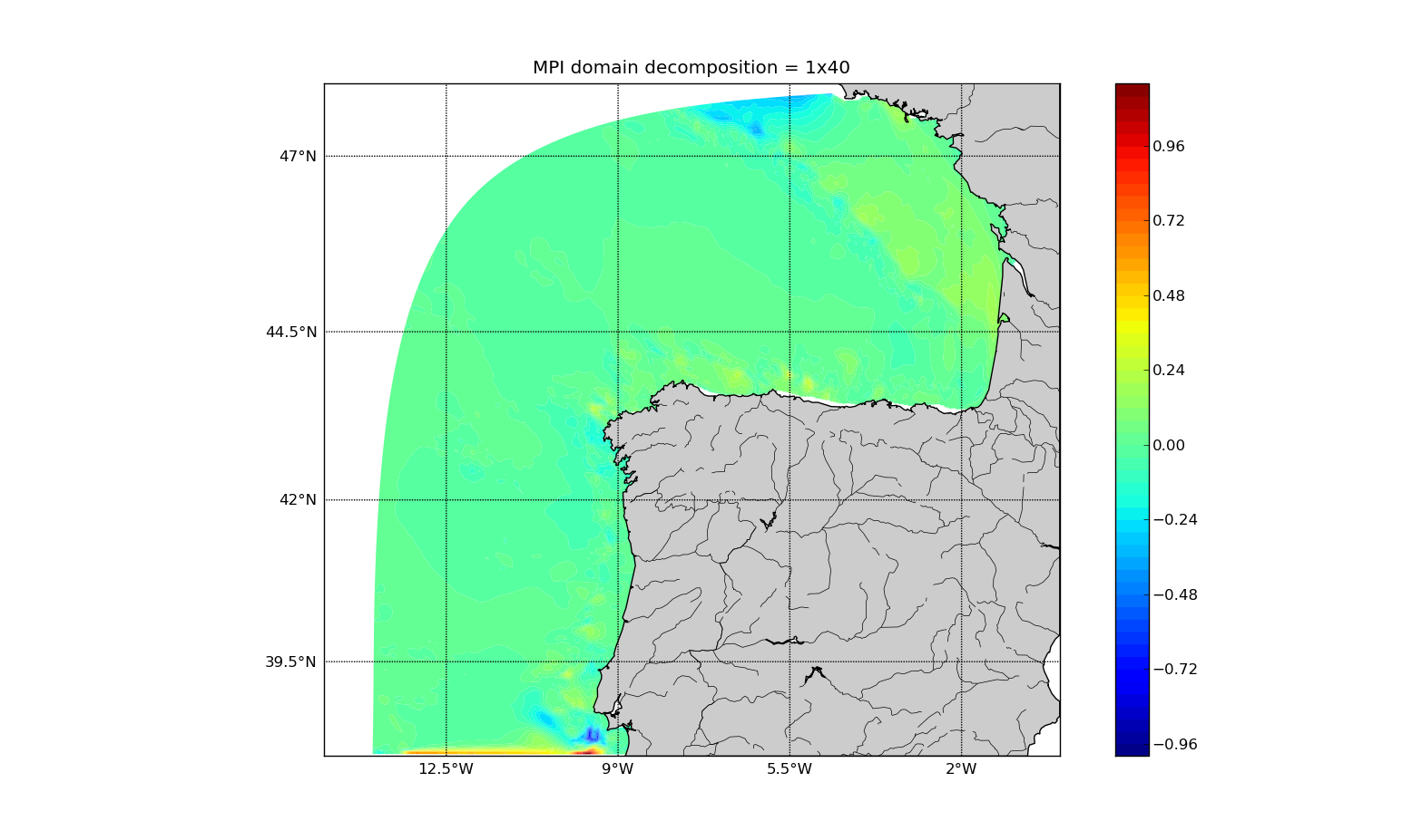 The run for the 6x4 domain decomposition didn't work either. Besides, I noticed there are differences between the OpenMP 4x4 and MPI 1x35 runs. In temperature the maximum difference is over 2.5 degrees. The differences in temperature, salinity, zeta, u and v concentrate near the shelf break, mainly, and have a similar pattern.