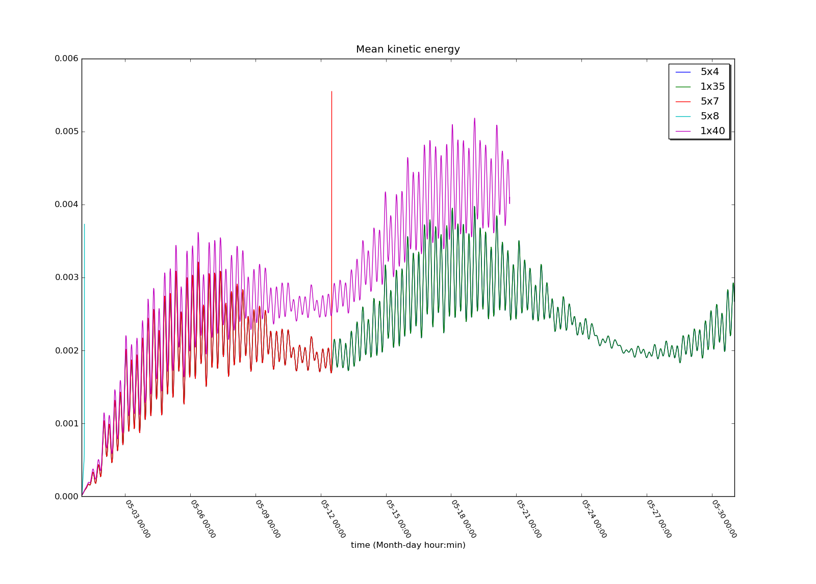 With the different configurations, normally there is no difference in the mean kynetic energy (up to the point when it blows up), as you can see in the figure attached (the blue and green lines overlap). But with some configurations using 40 processors (both 5x8 and 1x40) the mean kynetic energy increases, owing to a strong current near the southern boundary, that you can see in the plot. The configuration 1x35 worked, 1x40 didn't.