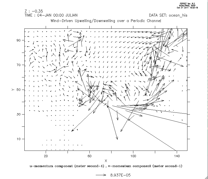 Thanks so much for the quick response. (Yes, I turned off periodicity.) You mentioned stratification. I used ANA_INITIAL to set the initial T and S to constants, so there should be no stratification. Would you still expect the pressure gradient problem to create velocities? It appears so. Yes, I agree that the magnitude of the velocities are small, but the problem arises when I substitute my grid for the analytical grid (using the same cppdefs above). See attached model results. So perhaps it is more a problem with my grid than the pressure gradients. I've smoothed bathymetry a lot (using first a Shapiro to 0.35 and then also LP to 0.1), but I am still getting some noisy and fairly strong velocities. Is there another type of bathymetry smoothing I should be considering? Could there be something else wrong with my grid (created with Seagrid and then seagrid2Roms)?