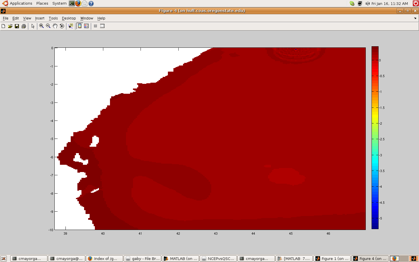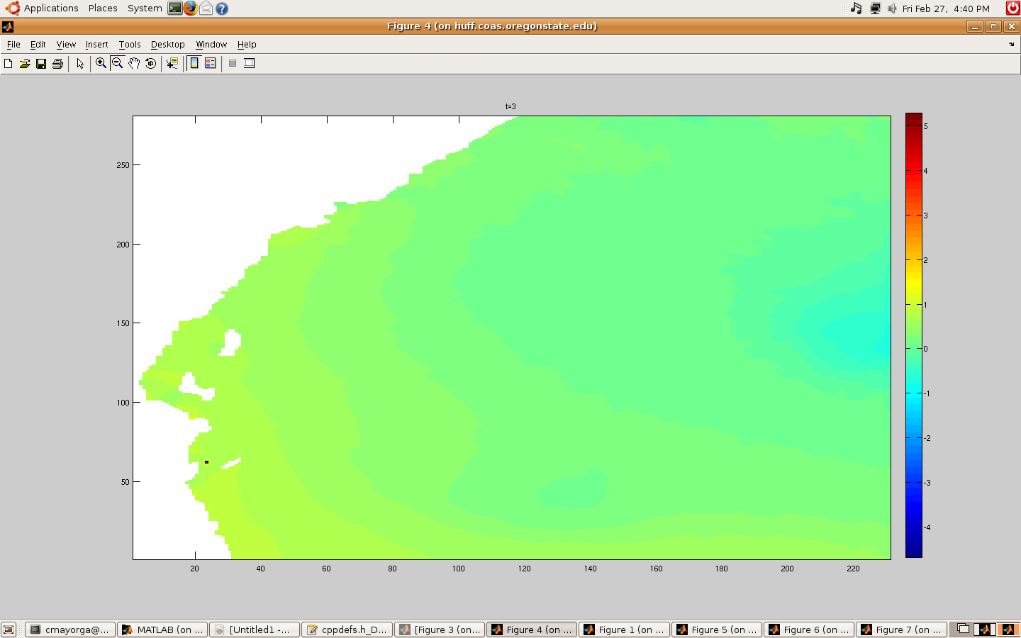 You want plots, you say. Here is a small patch of SST(nnew) after the horizontal advection, before any vertical operation, followed by later images of the same patch while looping through j. I stopped it after the vertical advection and before the vertical diffusion, so as to see which was causing the growth: