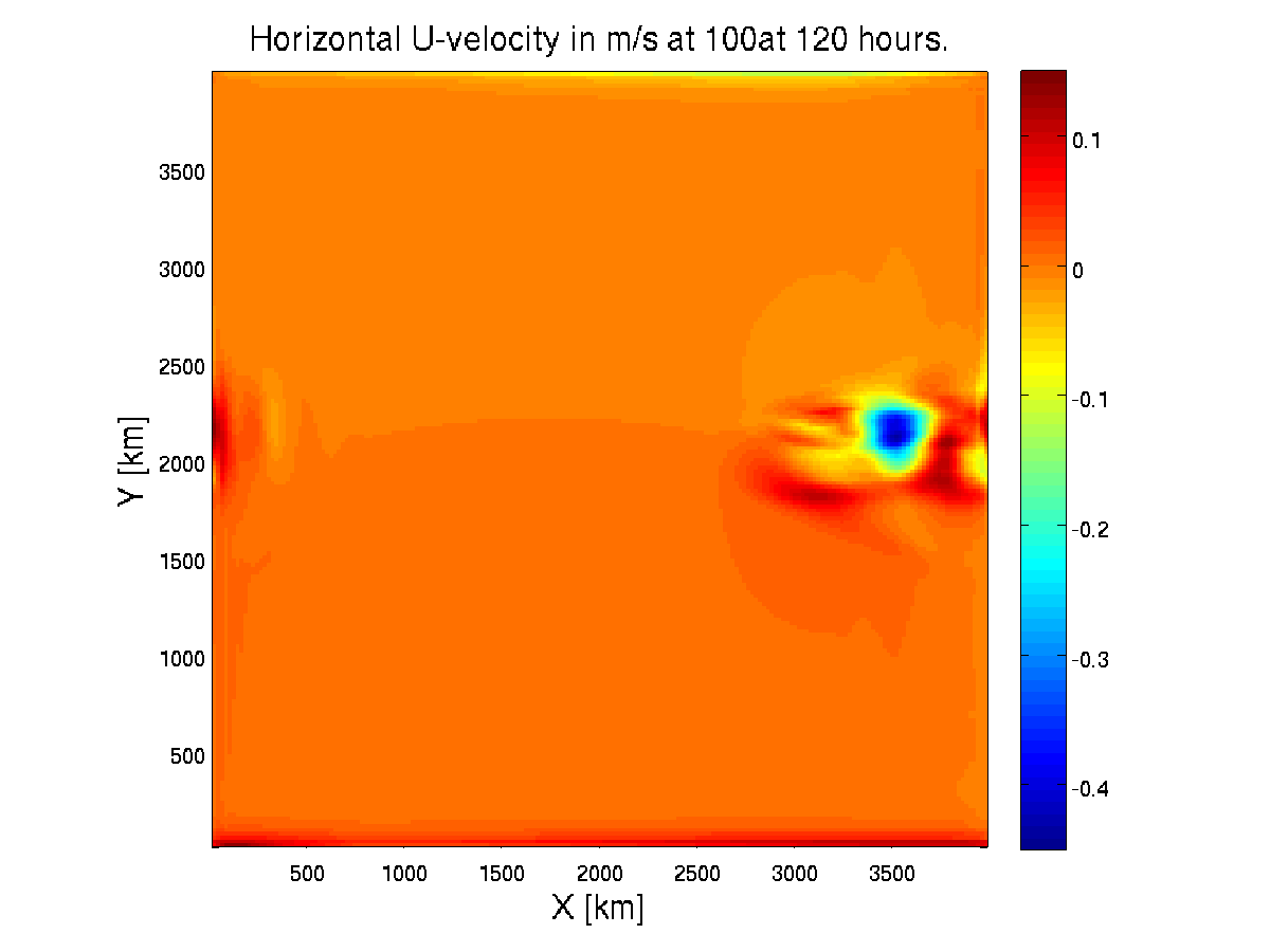 I understand that it seems that there's no periodicity in the EW direction in the pictures that I've attached, by here I post two other pictures (from the same simulation), where it is more evident. The first is the horizontal u-velocity field at the same depth (100 m) and the second is again the temperature field, but at an earlier instant.