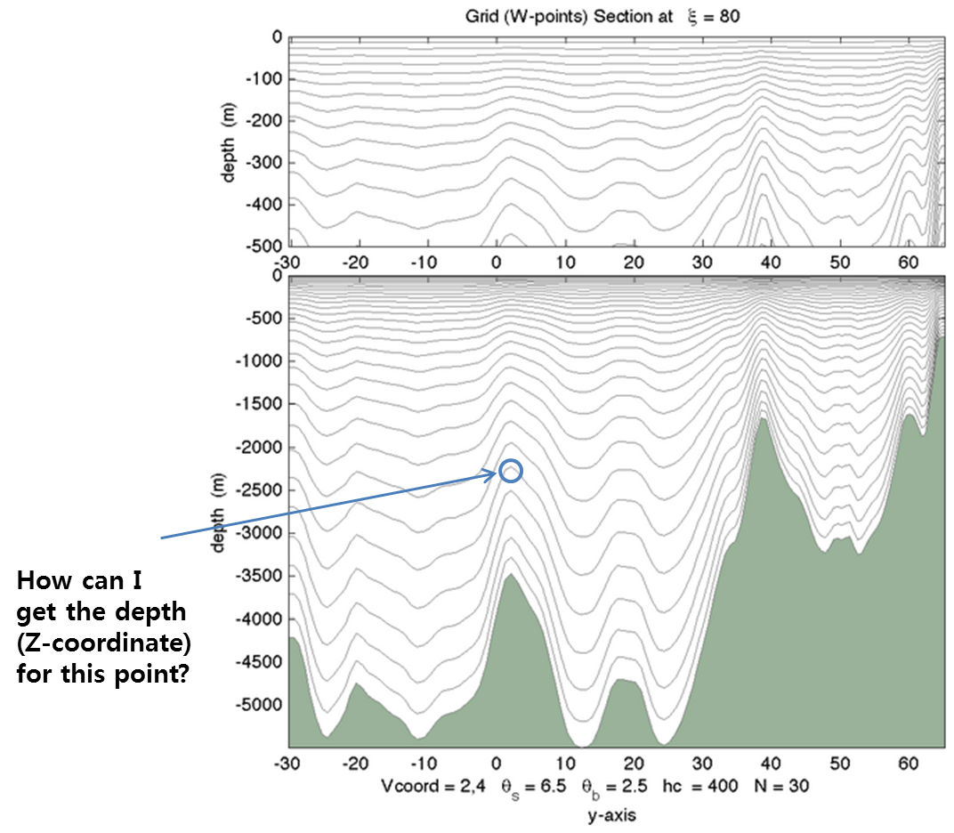 This point would be one in the z_w array within the code. There is also a z_r array for the rho point depths. This figure comes from a matlab script which also computes z_w the same way that ROMS does, doesn't it? Are you talking about finding that z_w value in the Fortran, Matlab or other?