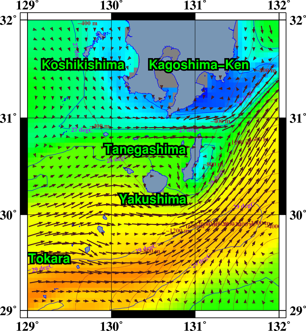 I wish to simulate the Japan-nearly sea current, Kuroshio, which current along the south-west islands of Japan to South Kyusyu, for example, Tokara islands, Yakushima, Tanegashima, and so on. (For all your recognition, I added the figure about the calculating area. Yet this figure was drawn my own viewer made by me using GMT commands.)