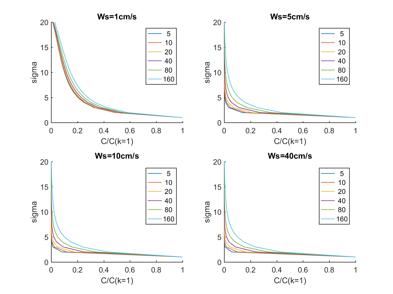 (i) the sediment relative profile (C/C(k=1)) tend to be similar for larger settling velocities, even more as dt increases (fig 1). In figure 1 each panel is for a specific DT, and the different lines represent the different settling velocities.