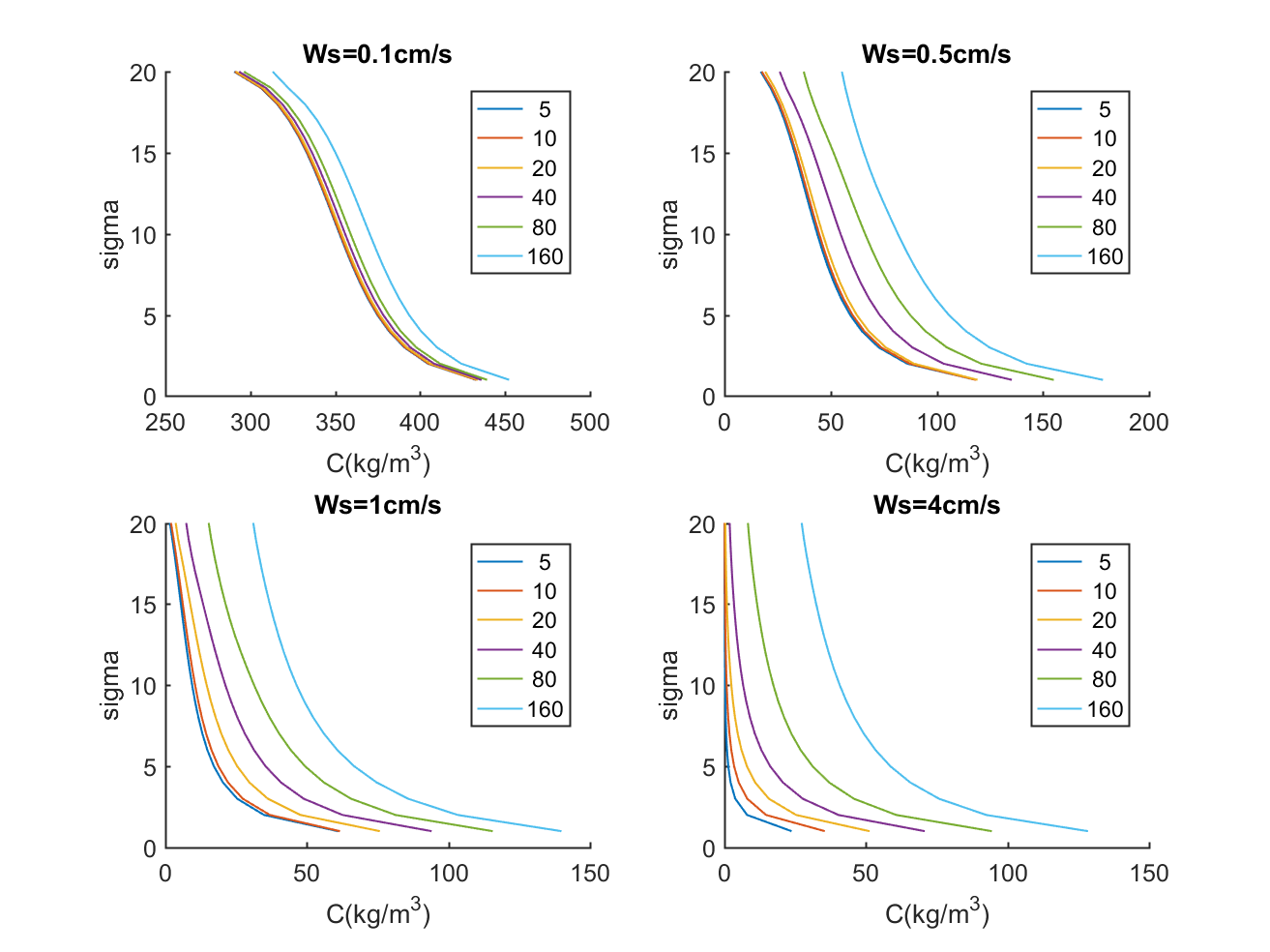 - For the lower settling velocity, we have ws*dt is 1cm/s*160s=160cm=1.6m. That is probably more than the bottom cell thickness, probably into the second layer. As you can see those profiles (different dts for ws=1cm/s) do not vary much for all those time steps. This is because the settling is only removing a smaller total fraction.