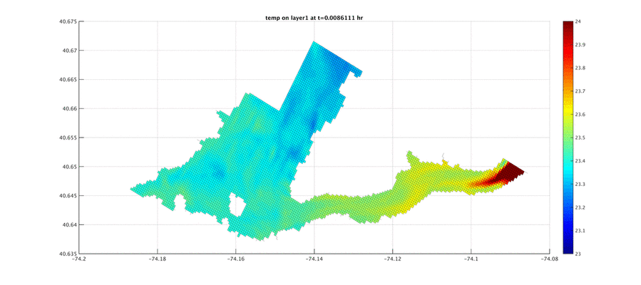 I am working on a case study of simulating the water current of estuary without wind forcing. The boundary condition and initial condition (including temperature, salinity, ubar, vbar, uvel, vvel, zeta) were interpolated from another hydrodynamic model simulation result. I have complete a 72-hr simulation without crash. However, the problem is that the result shows spatial discontinuity as the attached gif file shown.