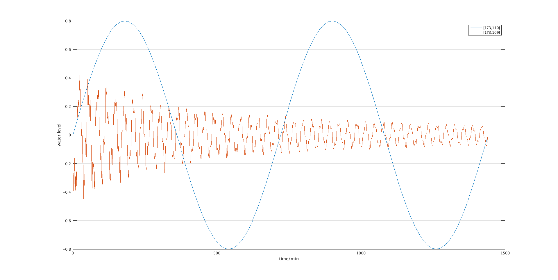I suspect the boundary condition may have some problem, so I tried to do some idealized run: only open one boundary (north boundary) and only apply free surface as boundary condition(Clamped), and set the initial condition as 0. However, the simulated zeta of the cell inside of the domain has high frequency oscillation, which is pretty different with the water level on boundary. I also attached a figure to show the zeta time series of cell on the north boundary (blue line) and the cell inside of the domain (orange line). I guess the reason of the oscillation is I closed all the other boundaries, but I am not sure....