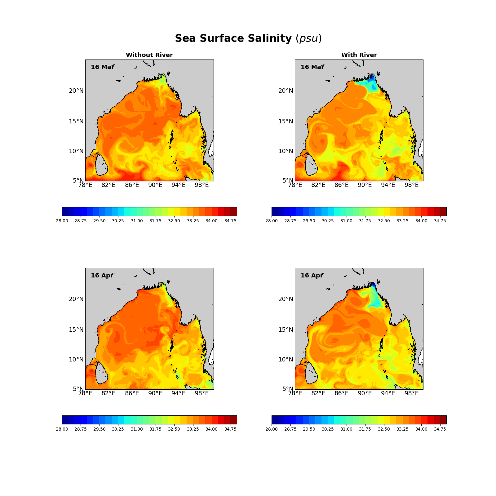 Both simulations are identical in every manner except I switched on the LuvSrc == T and LtracerSrc == T T ( to add the river discharge in the second case)
