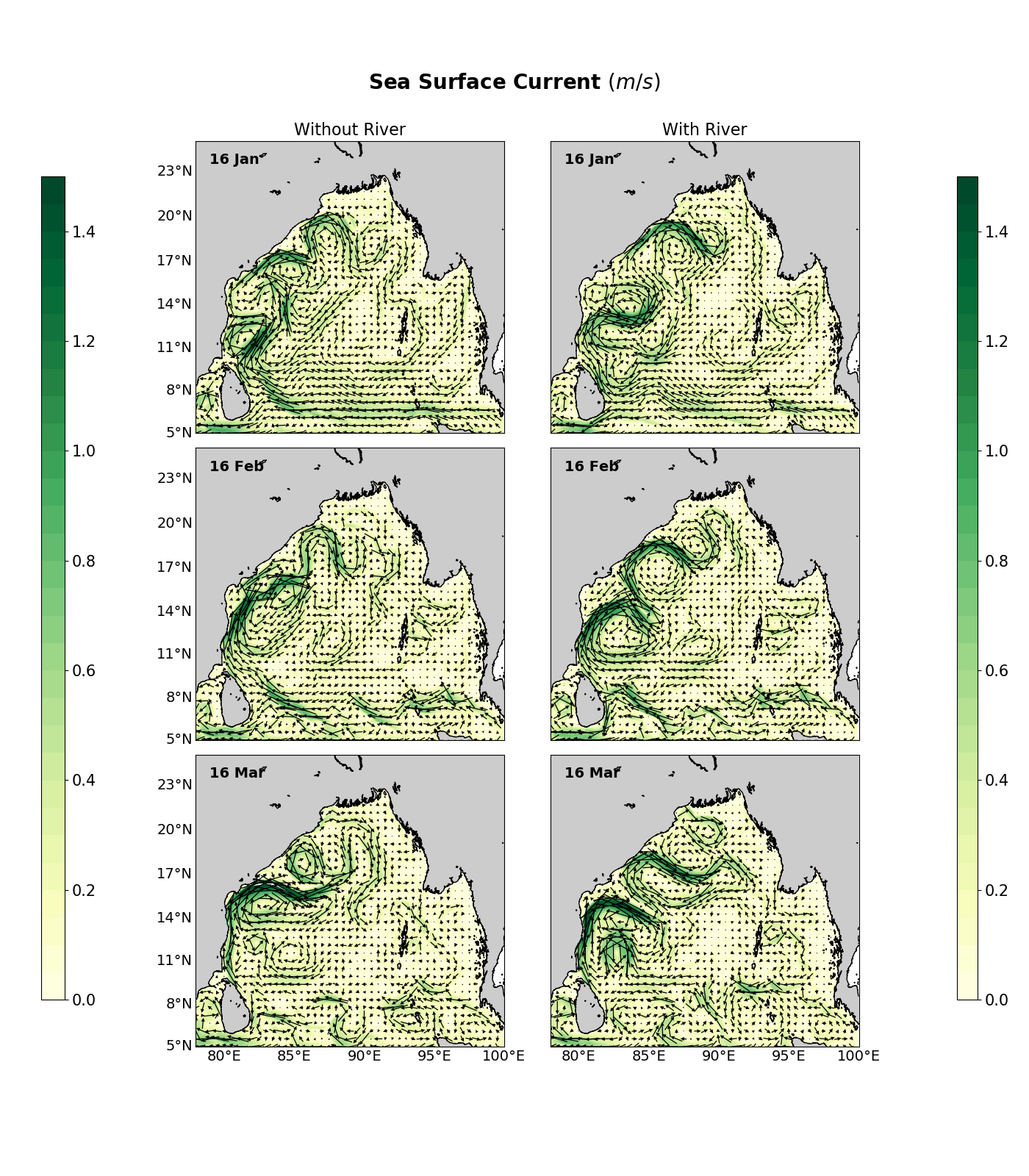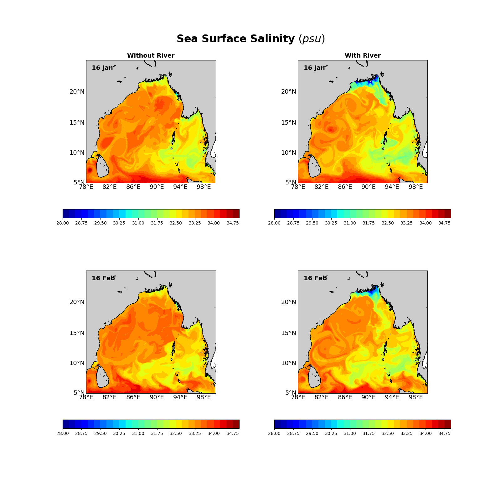 Both simulations are identical in every manner except I switched on the LuvSrc == T and LtracerSrc == T T ( to add the river discharge in the second case)