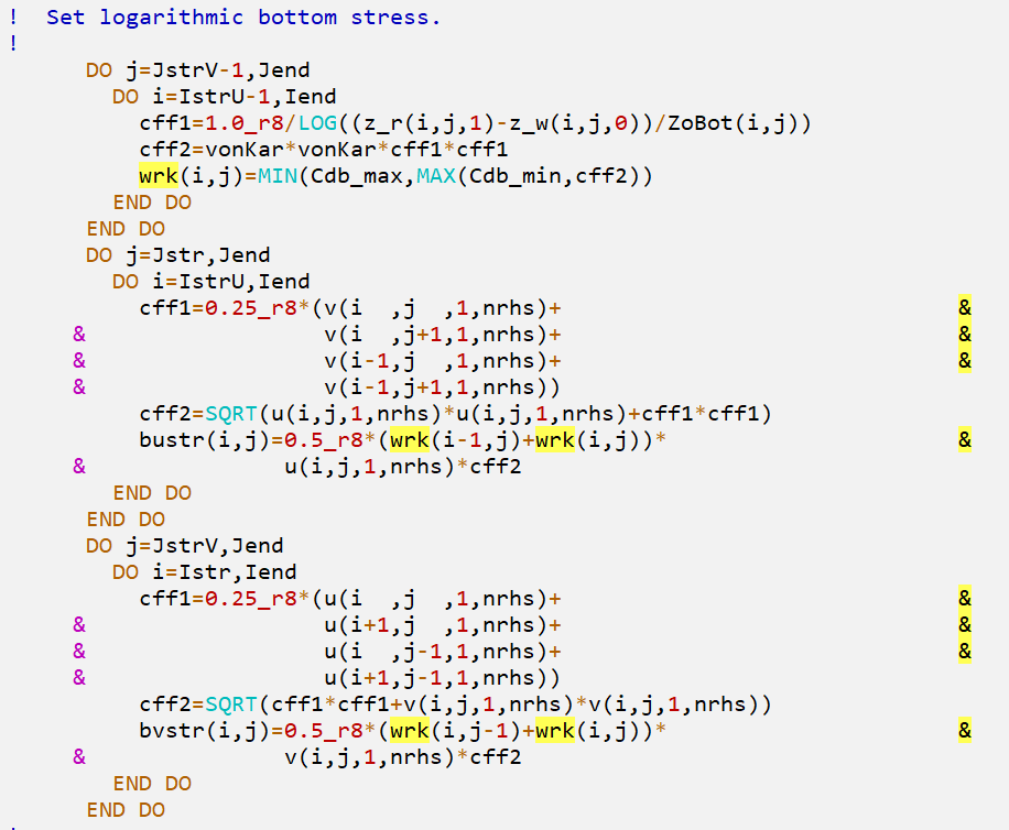 (2) I activate the "UV_LOGDRAG" to use the logarithmic bottom stress in <set_vbc.F>. The maximum and minimum value for drag coefficient <Cdb> are 0.5 and 0.000001, just the default values in <mod_scalars.F>. Do you mean that I should modify the Cdb_max and Cdb_min?
