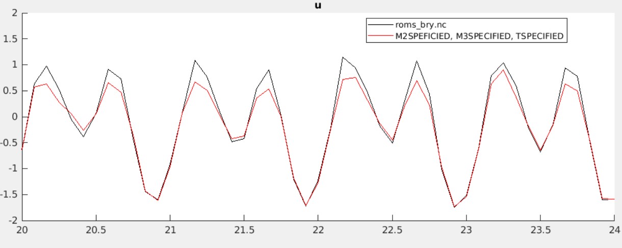 Then, after the ROMS run was finished, I checked the values of different variables at that particular boundary in the ROMS output. All variables but the u velocity match the input in the boundary file. What I cannot understand is that why u does not match the corresponding value in the boundary file even though a clamped OBC for M3 is prescribed.