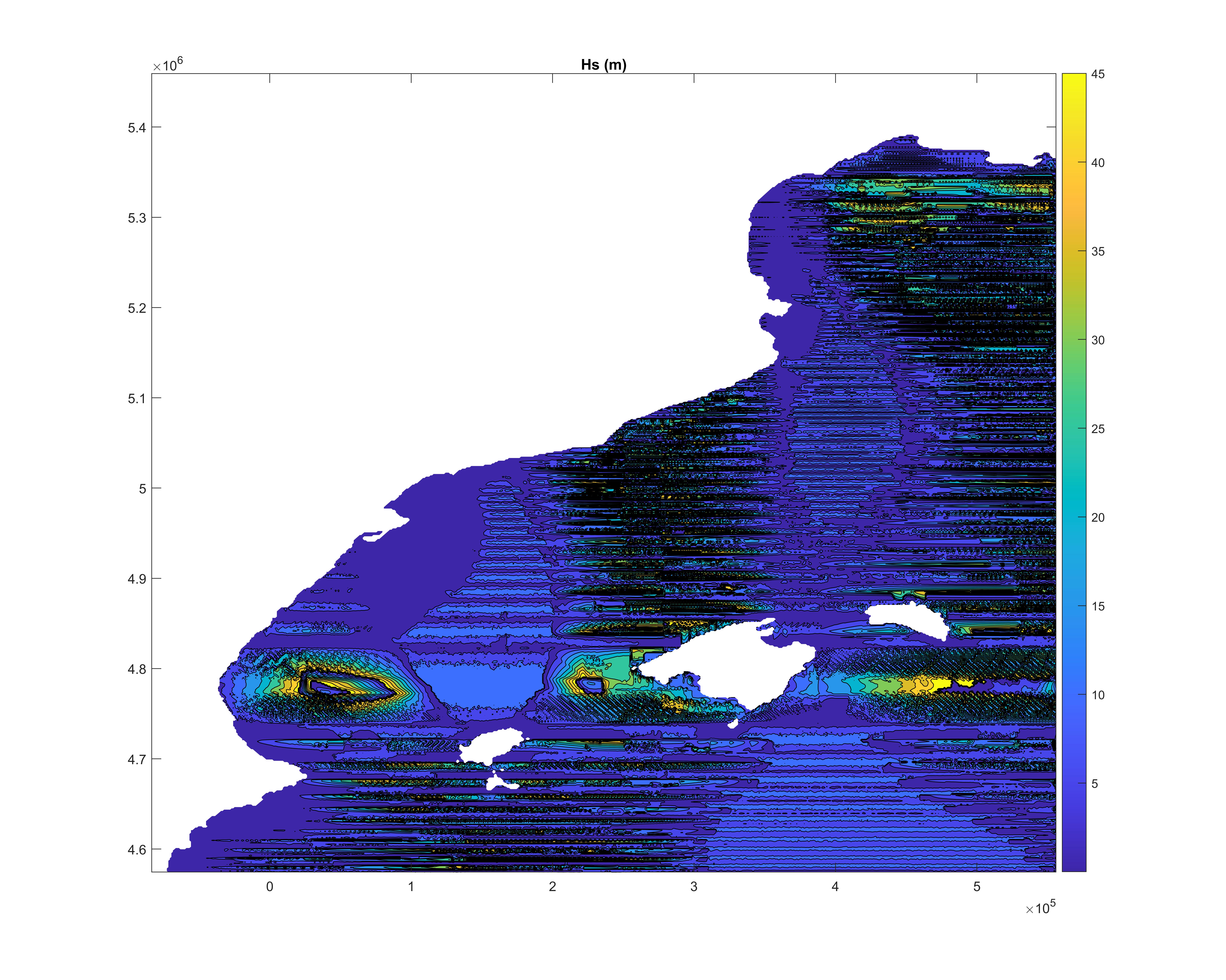 Then I switched to only SWAN and tried to run in stationary and when got 75 % convergence i let it run for 1h in non stationary, the result is attached here, doesn't have sense, looks like numerical unestability and waves have 45m height in Mediterranean Sea. Do you know what could happen? wrong initial convergence (75%) ?