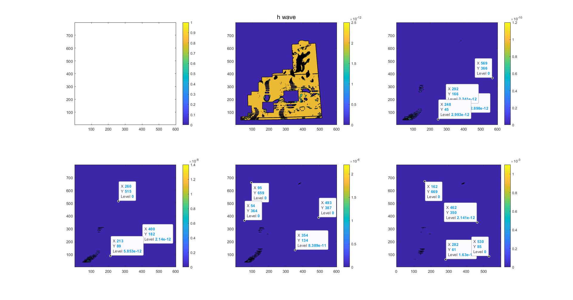 I started the simulation with initial default, after 3h (5 seconds timestep 3 models) the waves still have 1mm Significant height, and a terrible resolution, it's a 600x600 grid and looks like 10x10.
