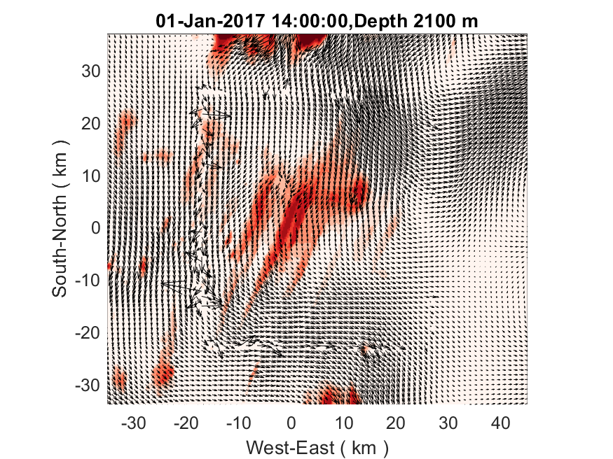 The plots below show 2D velocities and the 3D velocities sampled at 1000 m depth. The two-way results are on the left and the one-way results are on the right. For those one-way results, I averaged the fine-grid solutions based on the 5:1 refinement ratio and used the averages to replace the coarse-grid solutions at collocated grid points. It is noticeable that the two-way results show apparent discontinuities near the nesting interface. The disruption in flow mostly occurs at the locations where the bathymetry changes significantly across the nesting interface. In comparison, the one-way results are much smoother, in which the nesting interface appears almost transparent, which is a sign that the interface is behaving properly. Such differences between one-way and two-way experiments are persistent in all the tests I have done that feature realistic bathymetry as shown in my previous posts.