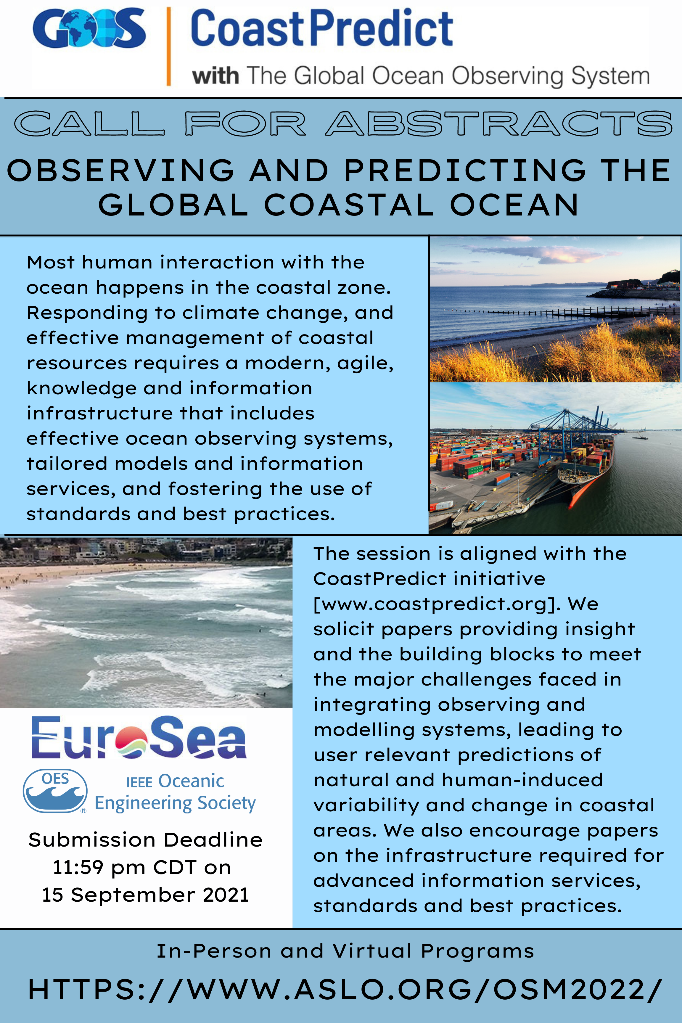 We invite contributions from a broad range of scientists to a dynamic and trans-disciplinary Ocean Sciences Meeting 2022 session that we expect will set the stage for transformational ocean observing-modelling developments for coastal areas under the UN Decade of Ocean Sciences for Sustainable Development. The challenges facing ocean observing and modelling are numerous, and most human interaction with the ocean happens in the coastal areas. We invite you to contribute to help solve these challenges in the UN Ocean Decade and submit an abstract to OS11 Observing and Predicting the Global Coastal Ocean session. The call for abstract submissions is now open with a deadline of 29 September, 23:59 Eastern Daylight Time.