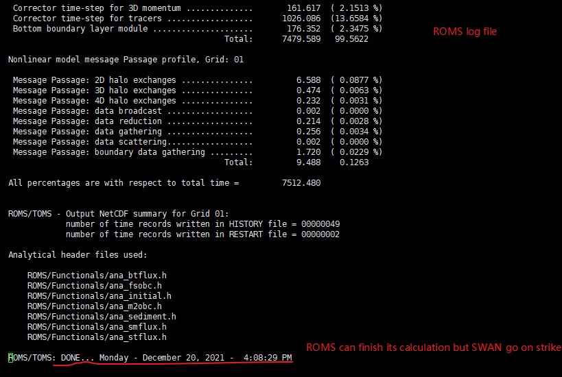 Hello,everyone, I'm running the inlet_test case form https://www.myroms.org/wiki/INLET_TEST_CASE. It can be calculated normally without error in ROMS Log file. But I cannot find any data in the SWAN output(.mat). The SWAN output data(.mat) has only 16kb. Obviously there is a problem. I've checked the PRINT file of SWAN, and it only calculate for 1 step and get stuck. Everything in this case are copied form trunk and I didn't change anythiny. Could you tell me what the problem is?