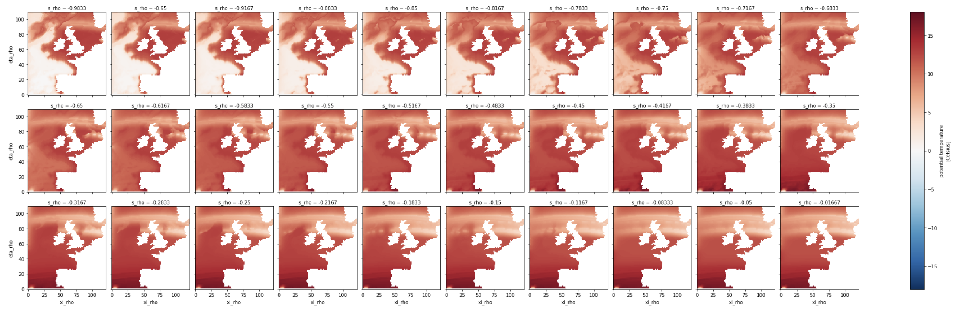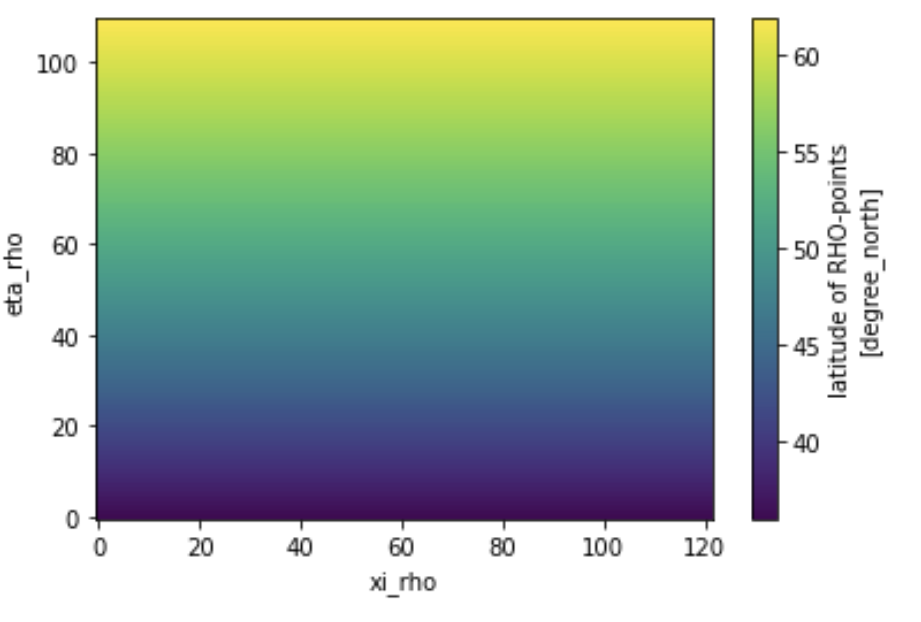 The input ROMS grid file (attached) I use has a resolution of 1/4°. The domain is rectangular from -20°E to 10°E and 36°N to 62°N (glorys has the same domain but 1/12° resolution). Because the domain is rectangular, xi_rho directly translates to longitude points and eta_rho to latitude points (see figures below).