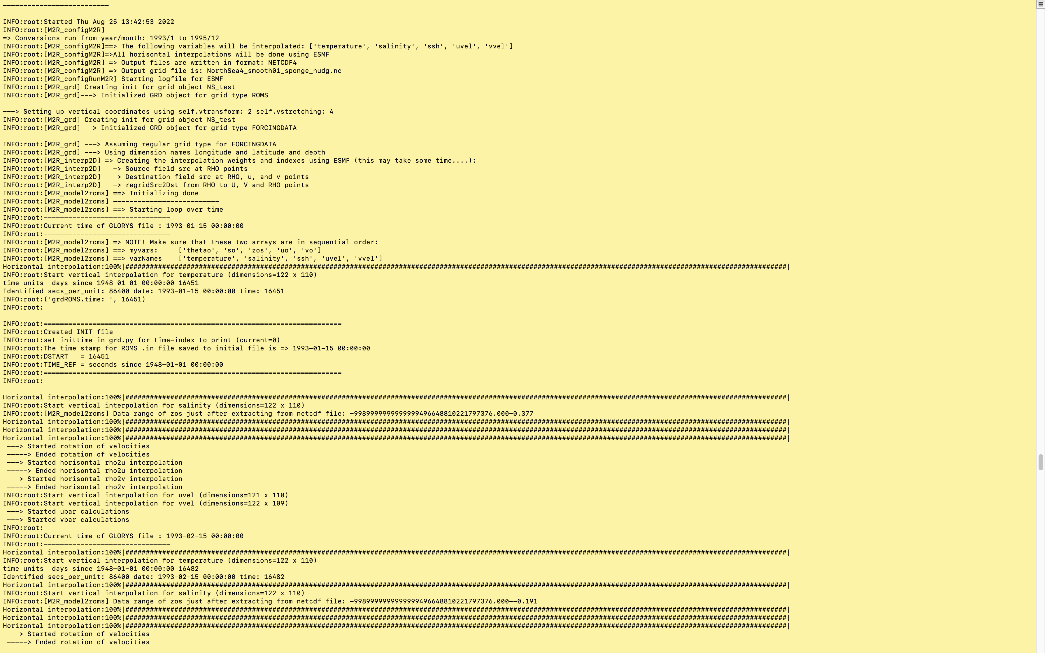 This makes me believe that the problem has something to do with ESMF not being able to do the horizontal interpolation using the ROMS input grid that is kind of 'rectangular' resulting in many 'duplicate' longitude values. However, I don't see others reporting on the internet about this error. When using xesmf myself to interpolate glorys data to this ROMS grid, there is no problem.