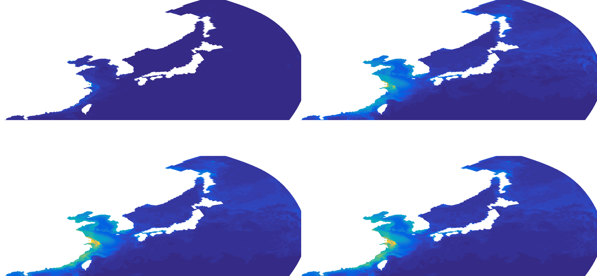 The first line is the result of turning off phytoplankton, we can see that the phytoplankton on the left has a significant reduction, the chlorophyll on the right looks like independent on phytoplankton, and the second row is the original result, the chlorophyll looks like dependent on phytoplankton.