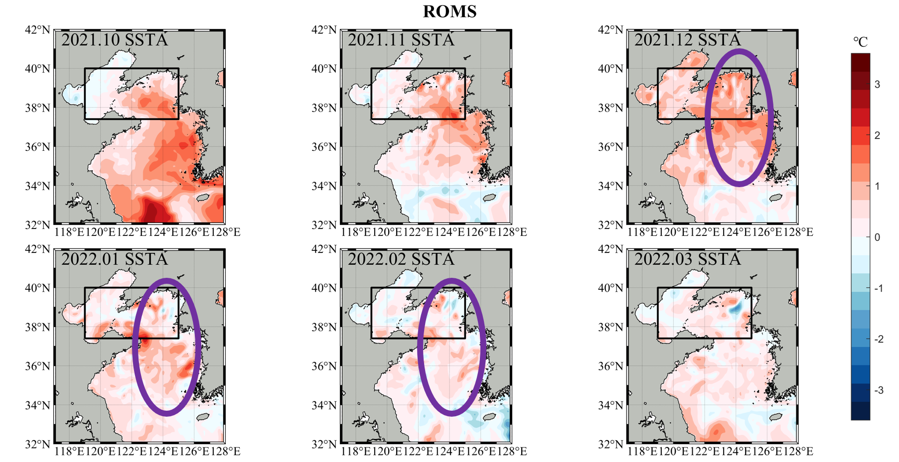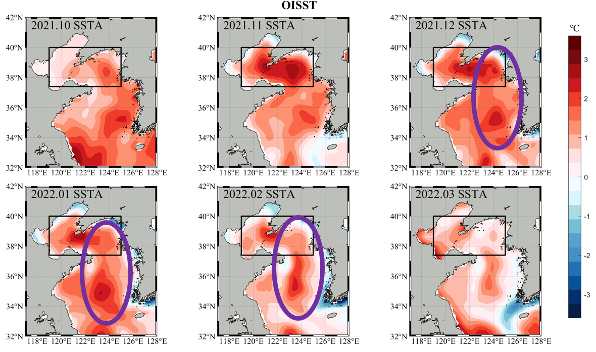 We can find that the ssta of OISST from 2021.11 to 2022.02 is relatively high, which extend to the whole Bohai Sea and Yellow Sea. The purple oval is the domain of Yellow Sea Warm Current, which show significant warming.