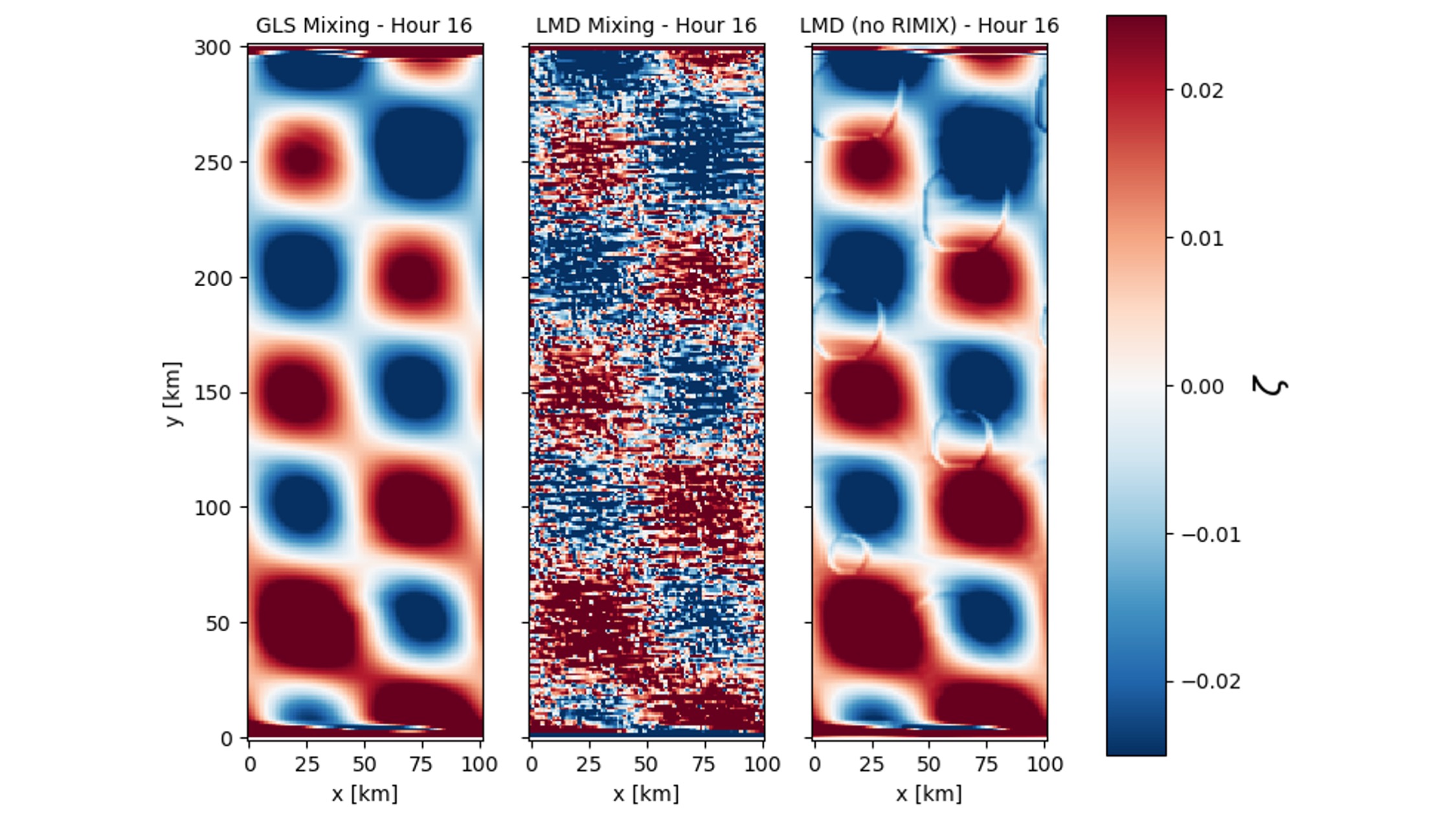 Hello everyone. I am working on an idealized ROMS simulation that performs well when using a GLS mixing scheme, but seems to produce errors when LMD mixing is implemented for the same test case. As an example, at the first time step the relative vorticities for the LMD mixing case in the attached figure appear to have some kind of averaging errors that grow over time (GLS comparison also shown). There are also times at which the depths of the surface boundary layer are positive (I've modified the colorer and chosen a representative time step to show this more easily). Pasted below are the cppdefs terms in my header file. Some of these averaging issues seem to improve if I run the simulation without LMD_RIMIX, but that seems like it would sort of defeat the purpose of comparing the two mixing regimes. I've also tried putting LMD_NONLOCAL, SPLINES_VDIFF, and SPLINES_VVISC back in, but they don't correct the issue either. Any ideas on what may be causing this behavior would be greatly appreciated, thanks!