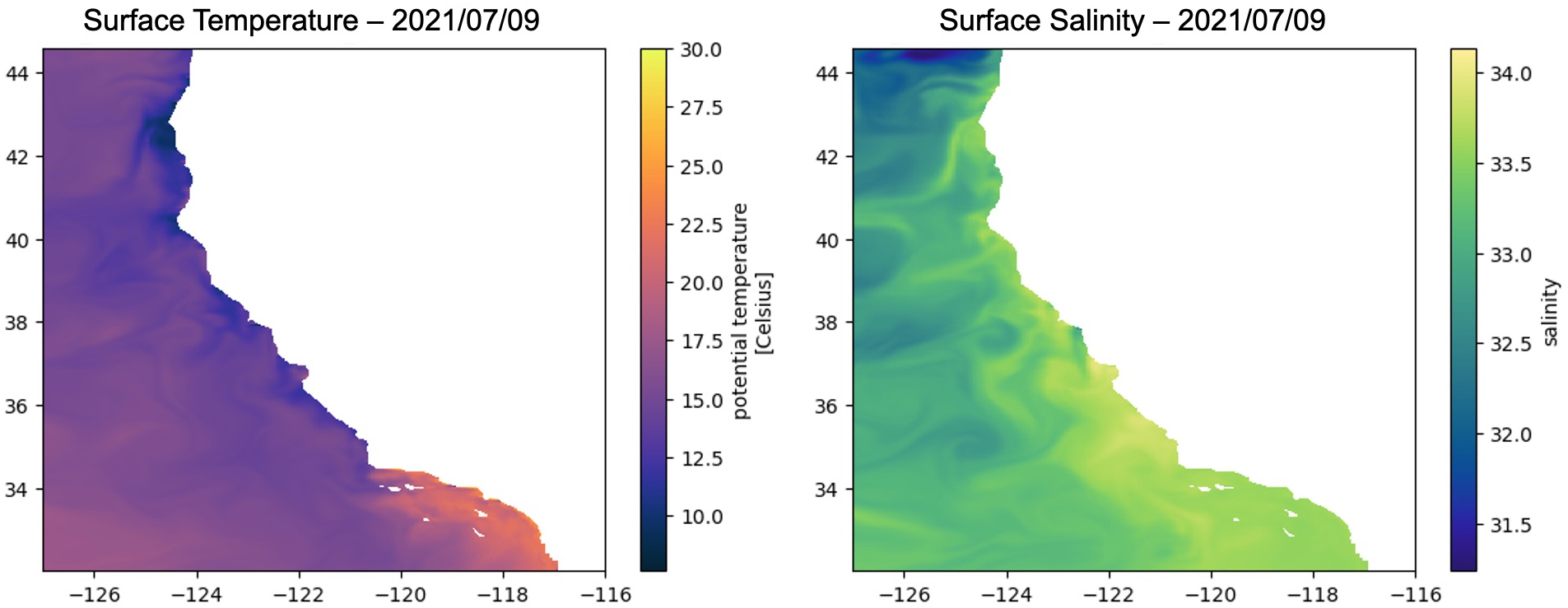 Thanks John. Temperature and salinity look okay to me, below are surface plots and western boundary profile views of both at the starting time step. The next time step is also basically identical.