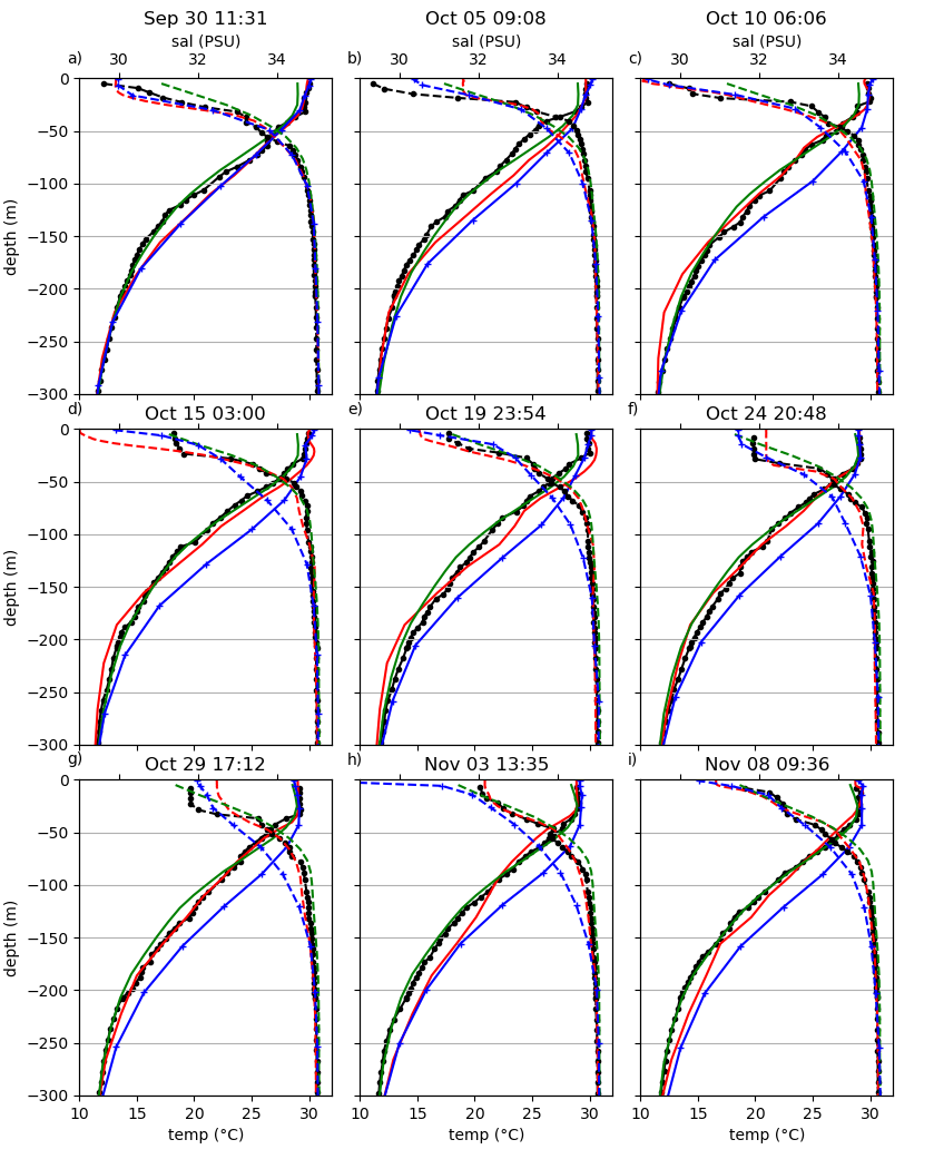 Blue lines are ROMS free run starting from Sept. 30, initialized from NEMO-CMEMS.