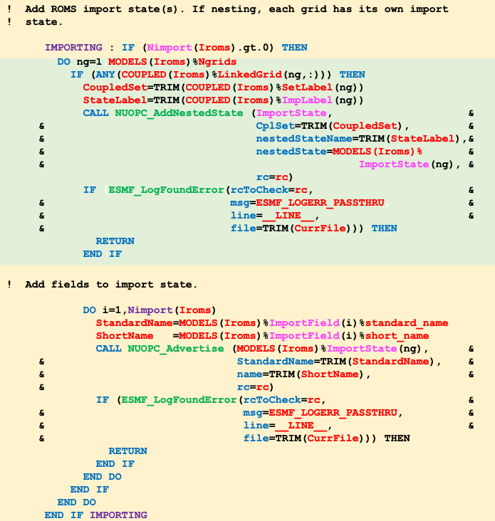 For example, the NOUPC cap module routines ROMS_SetInitializeP1 can be modified easily to add the coupled sets to the ImportState and ExportState as shown below in the green blocks of code.