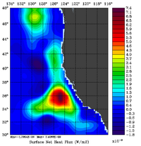 The R4D-Var posterior analysis error covariance (EOF 1) for free-surface (m), surface wind stress components (Pa), and surface net heat flux (W/m2) are shown below: